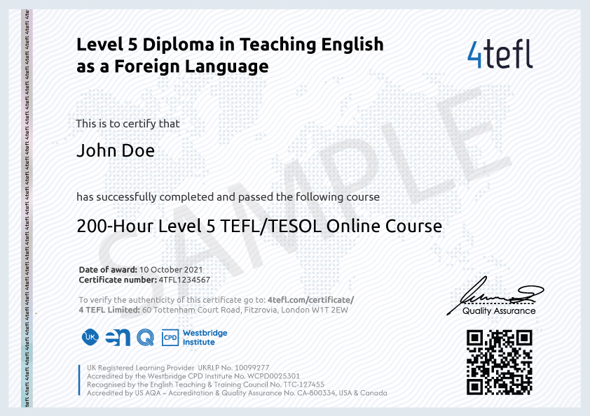 Level 5 TEFL qualification is issued by Focus Awards - an awarding organisation recognised and regulated by Ofqual.